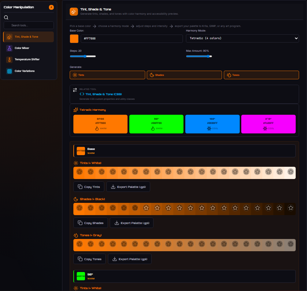 For newer users, it is a learning tool for color theory. For artists, it can be a powerful pallet generator that you can use to export new pretty palettes into Krita, Gimp, or any other setup that supports .kpl palette types.